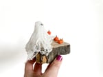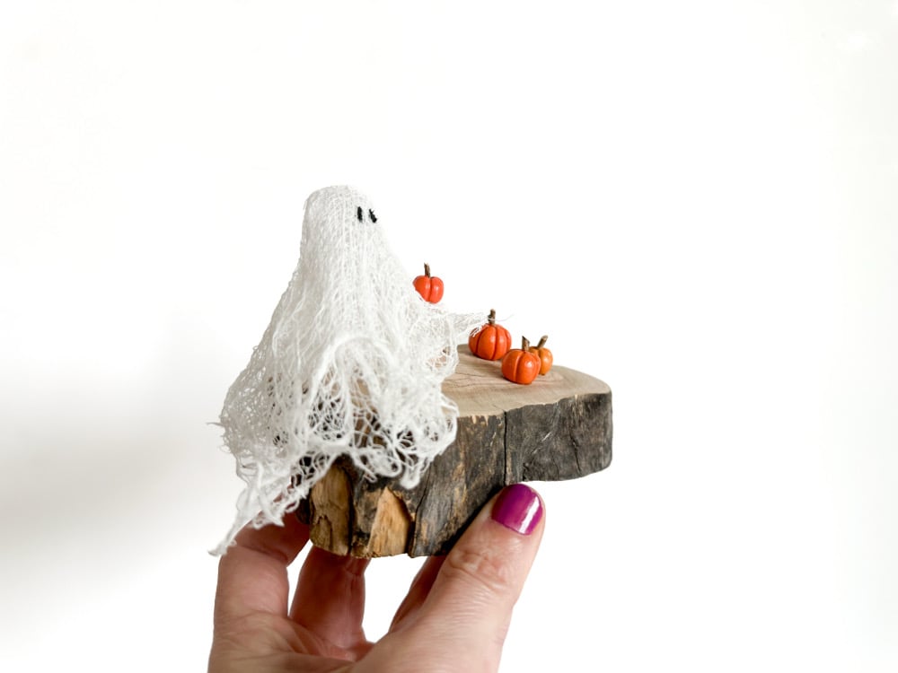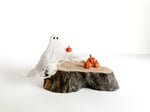 This piece features mini clay pumpkins and a ghost made from cheesecloth. All pieces are attached to the wood they sit on.