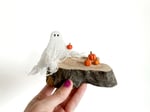 One-of-a-kind ghost and pumpkin scene on wood.