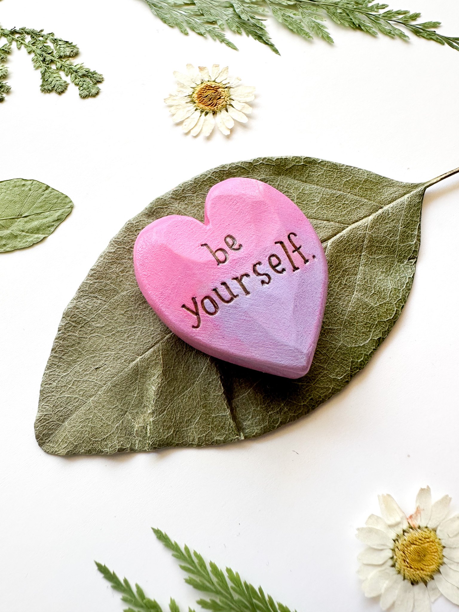 The heart is hand cut, sanded, wood burned, painted, and varnished.