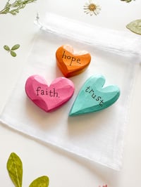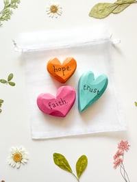 This set of 3 mini wood burned hearts includes the following phrases and colors: