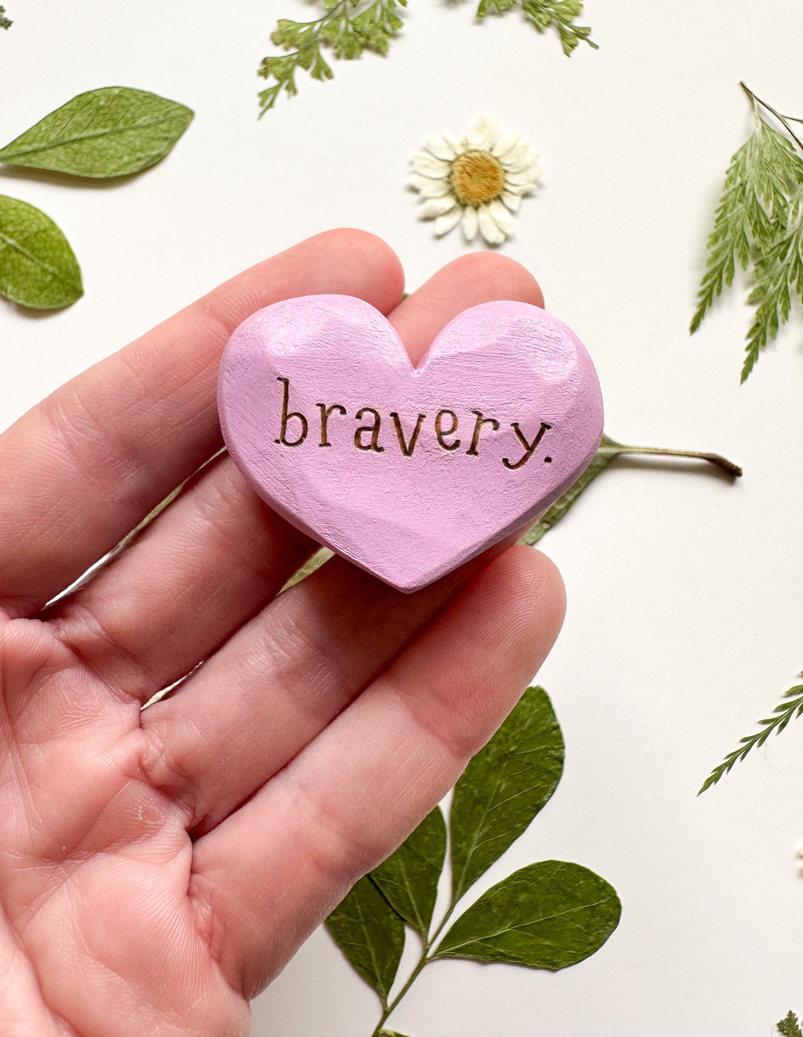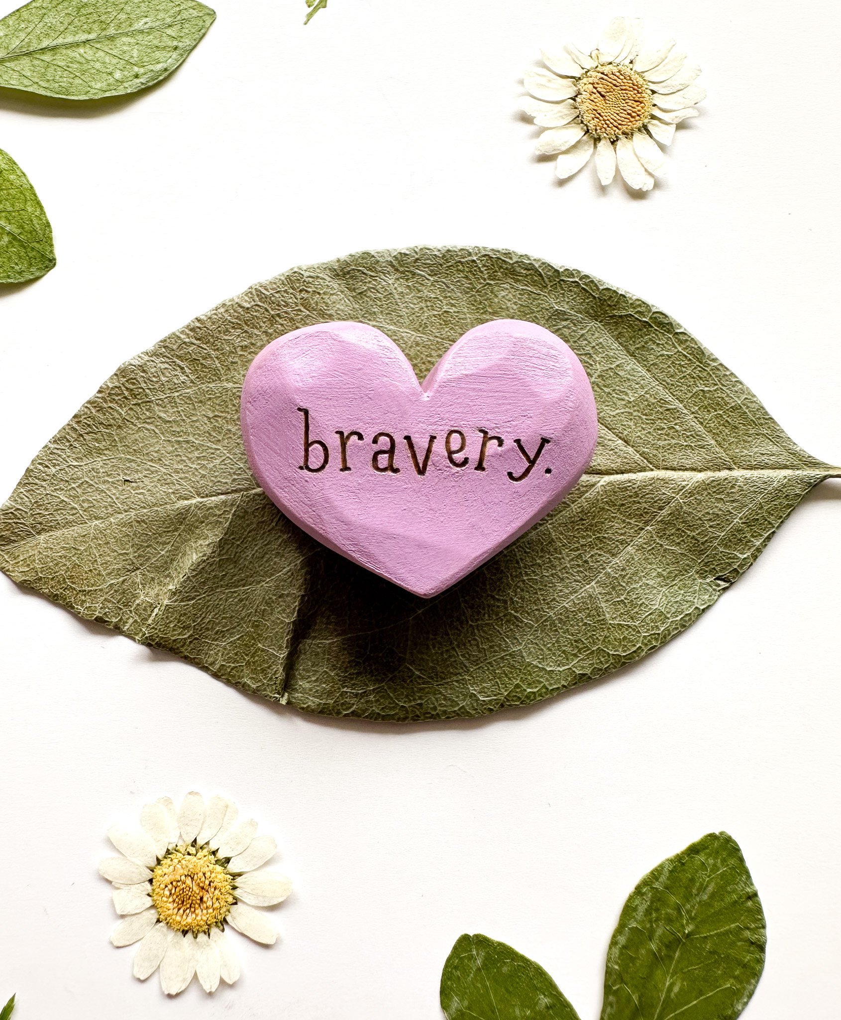 The heart is hand cut, sanded, wood burned, painted, and varnished.