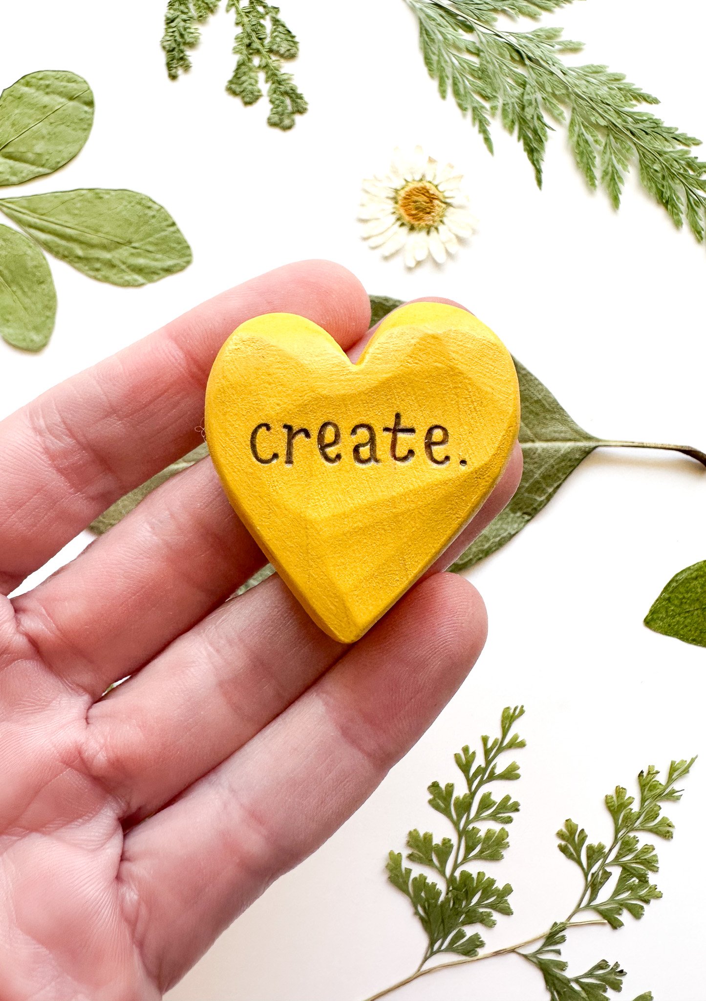 The heart is hand cut, sanded, wood burned, painted, and varnished.