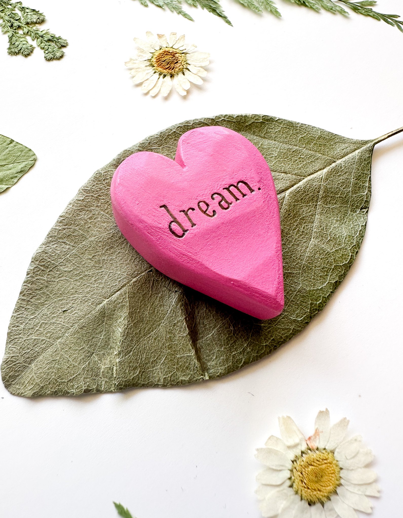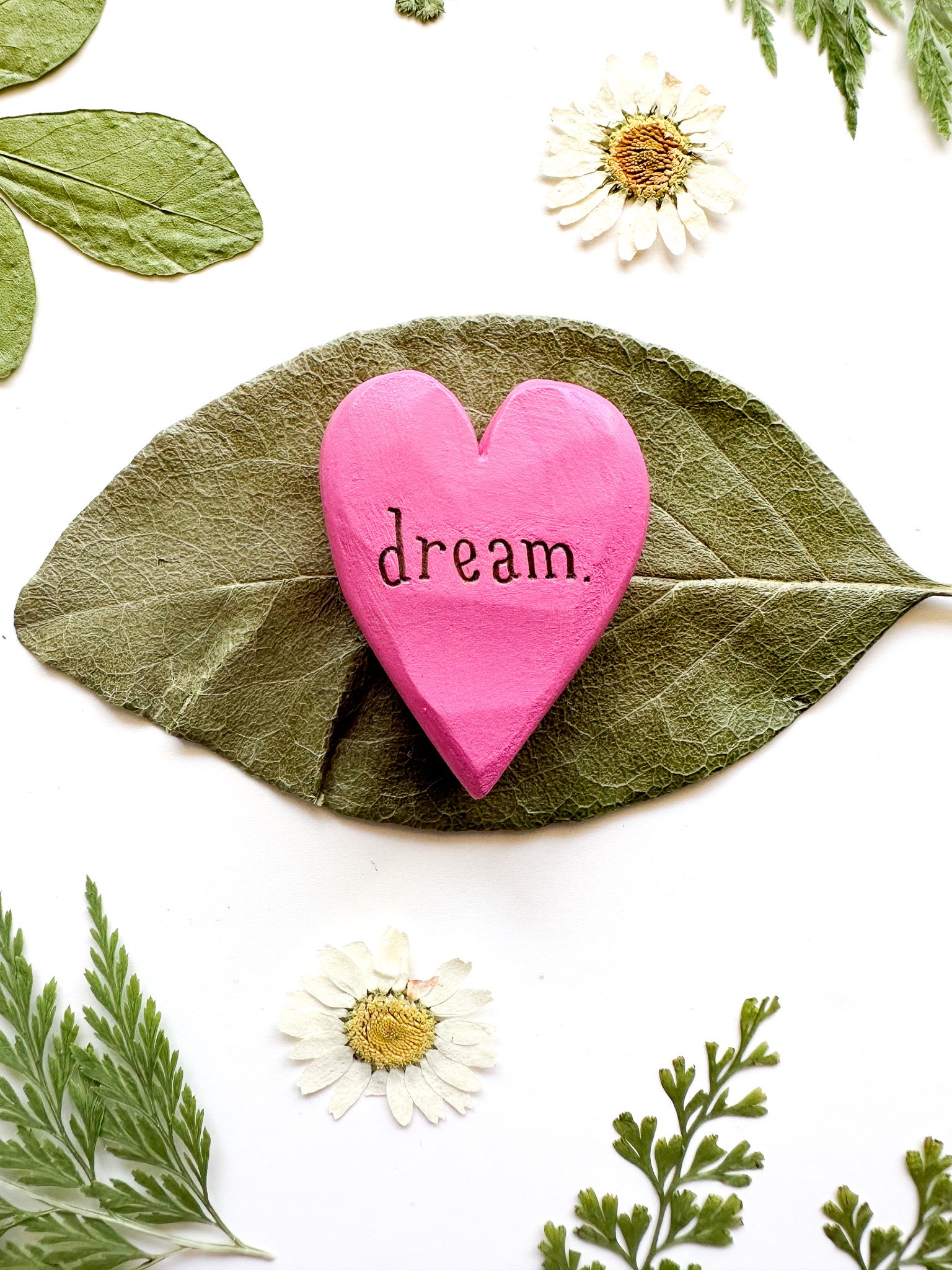 The heart is hand cut, sanded, wood burned, painted, and varnished.