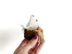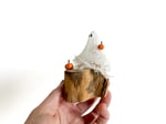 This piece features mini clay pumpkins and a ghost made from cheesecloth. All pieces are attached to the wood they sit on.