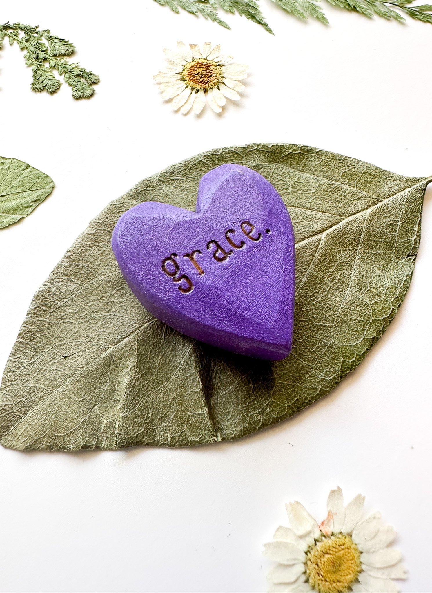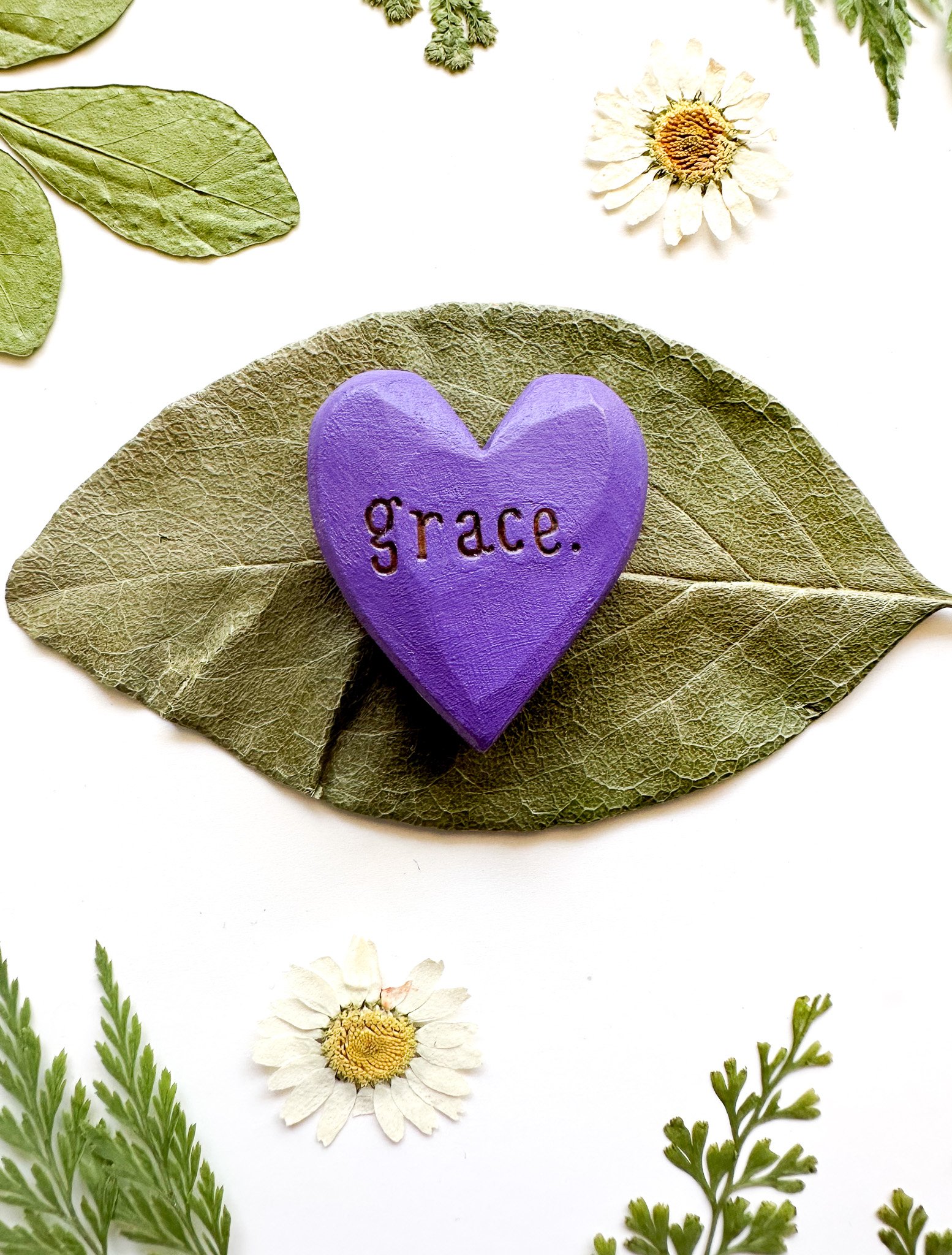 The heart is hand cut, sanded, wood burned, painted, and varnished.