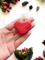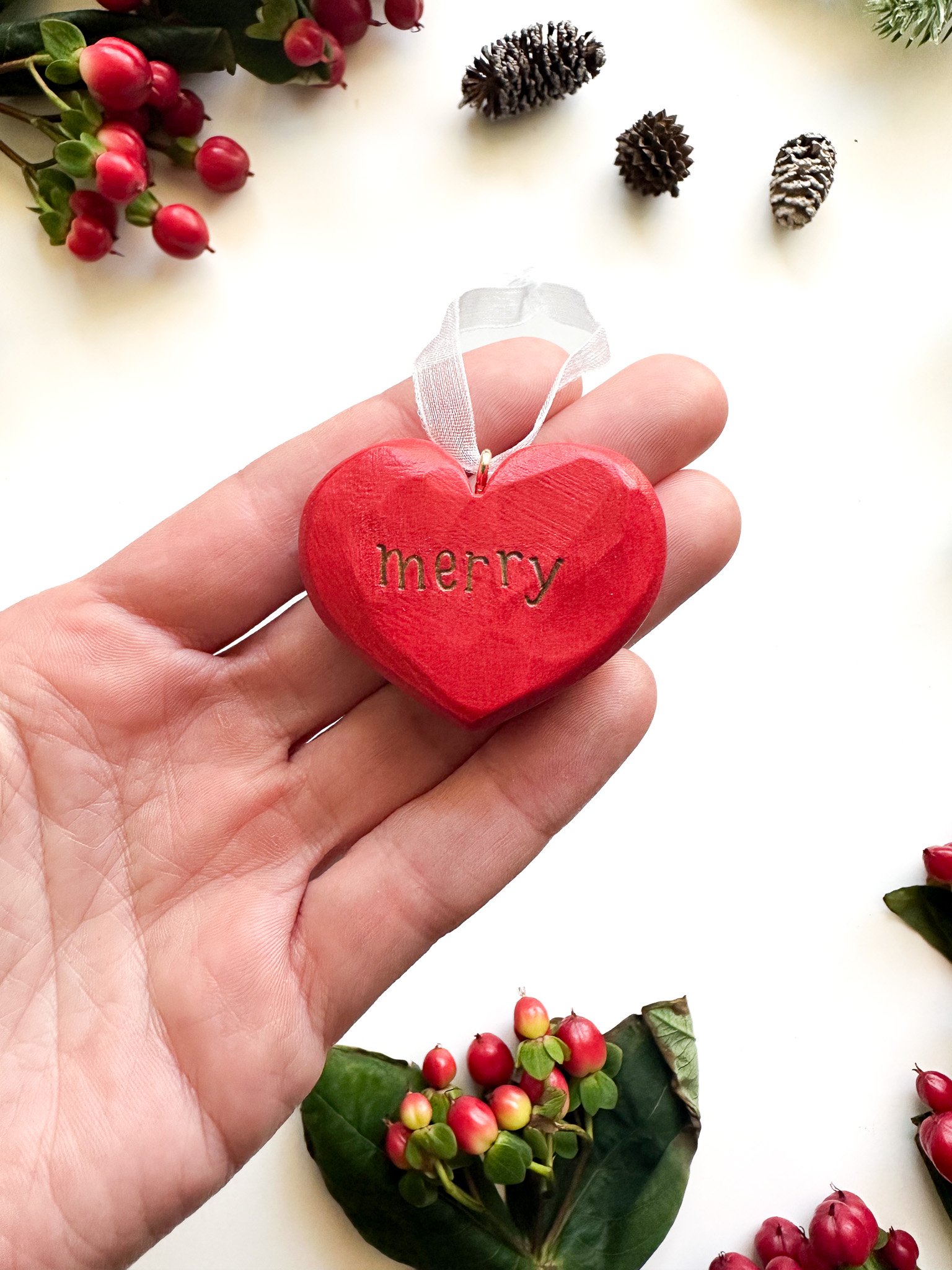 Preorder for one mini wood burned heart ornament. Each heart is hand cut, sanded, wood burned, painted and varnished, then tied with a sheer organza ribbon.