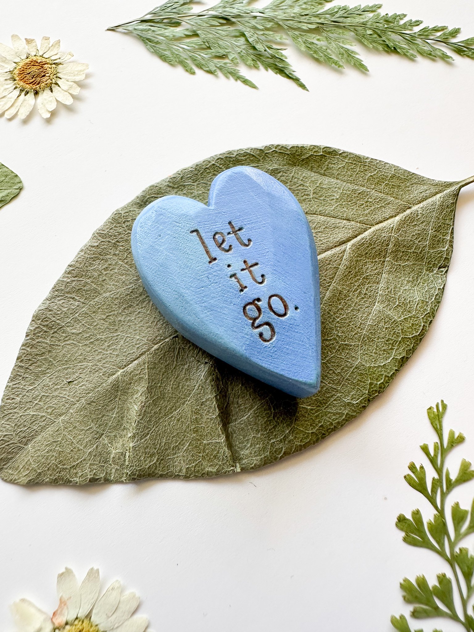The heart is hand cut, sanded, wood burned, painted, and varnished.