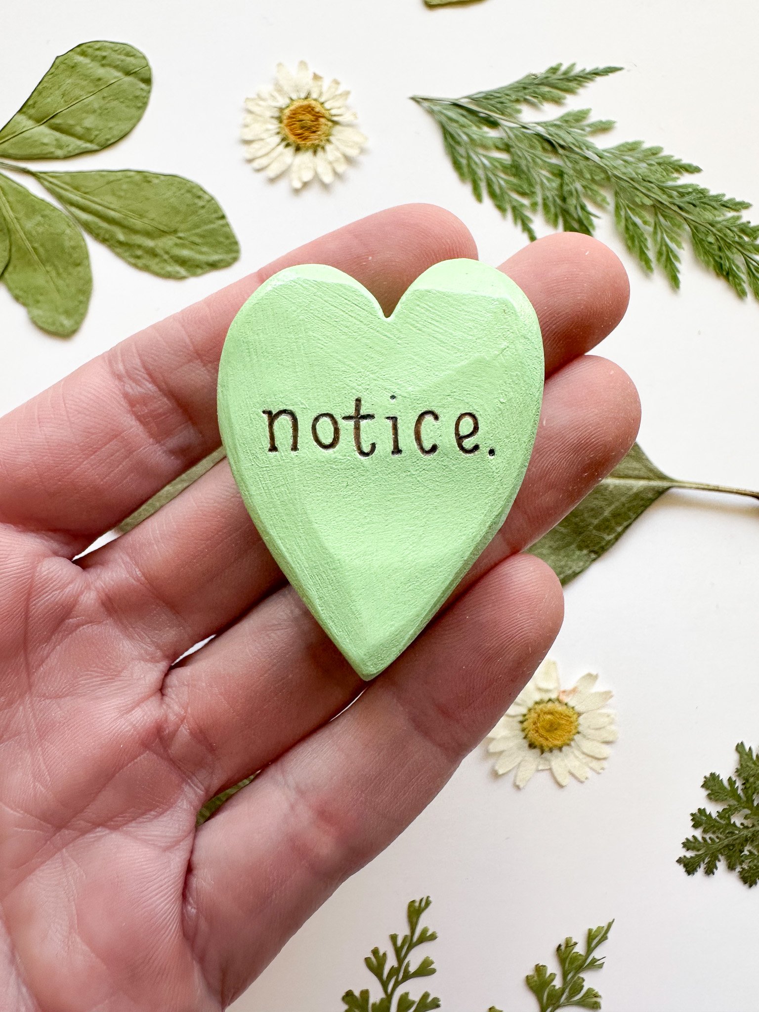 The heart is hand cut, sanded, wood burned, painted, and varnished.
