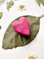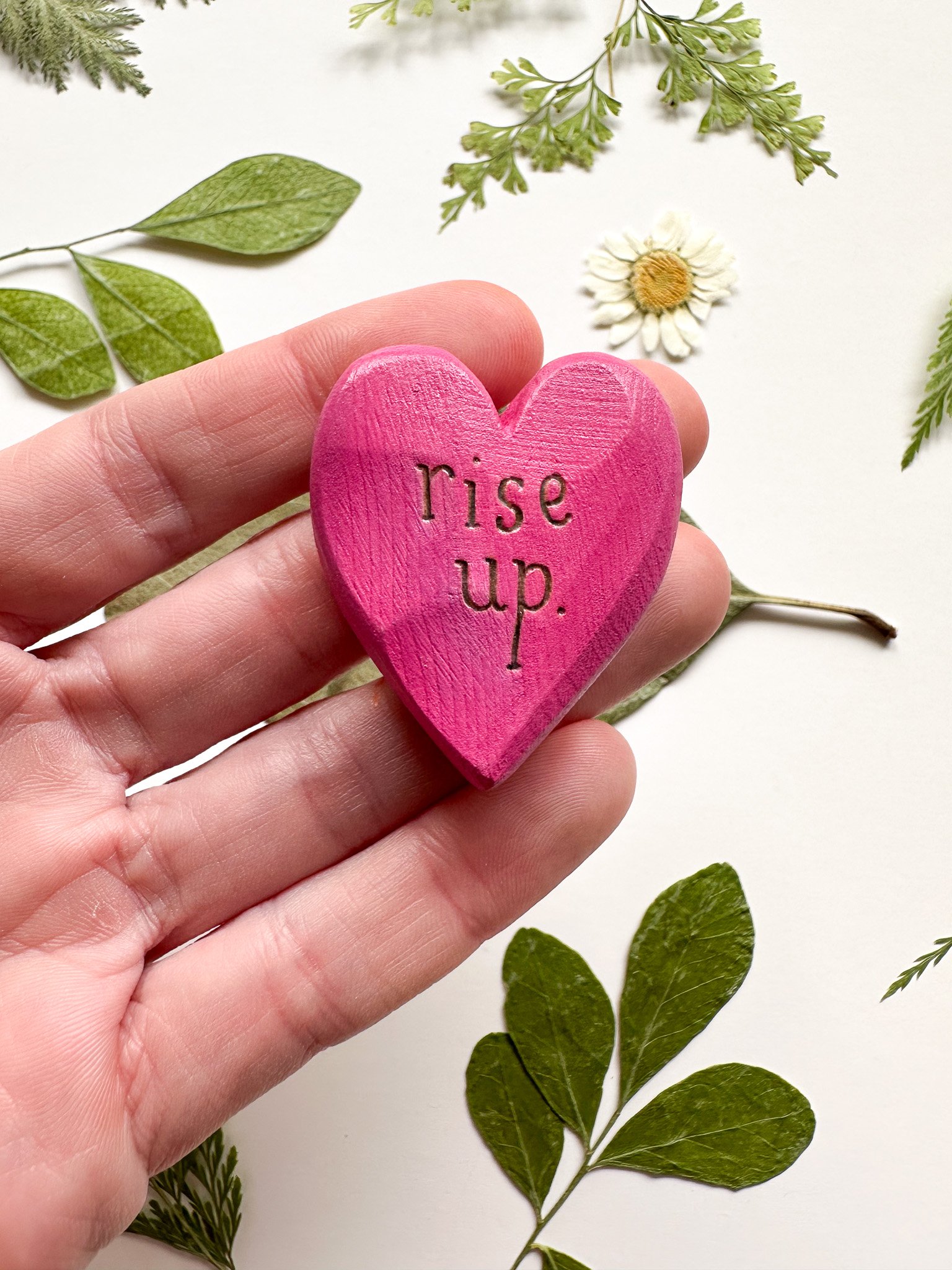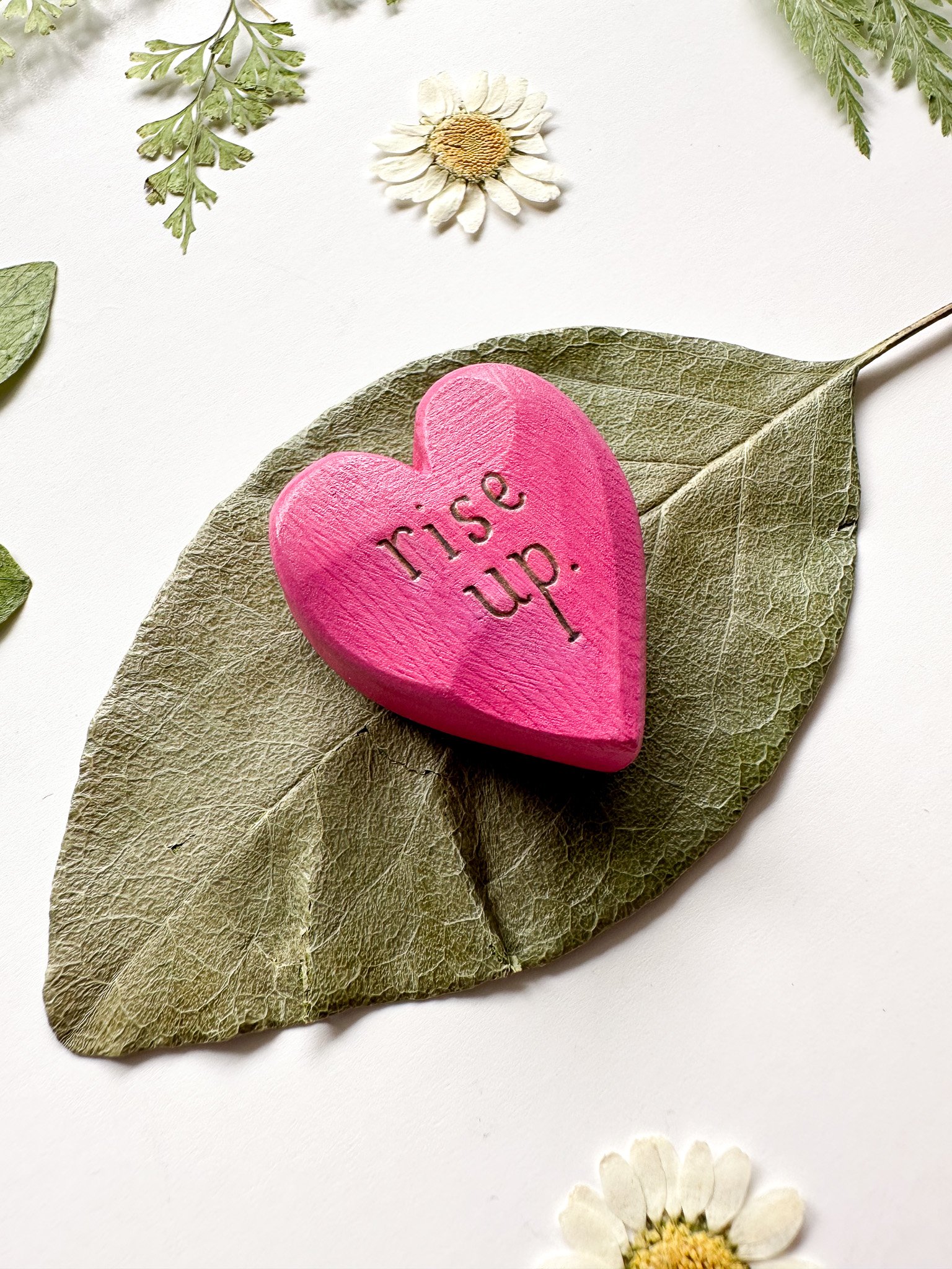The heart is hand cut, sanded, wood burned, painted, and varnished.