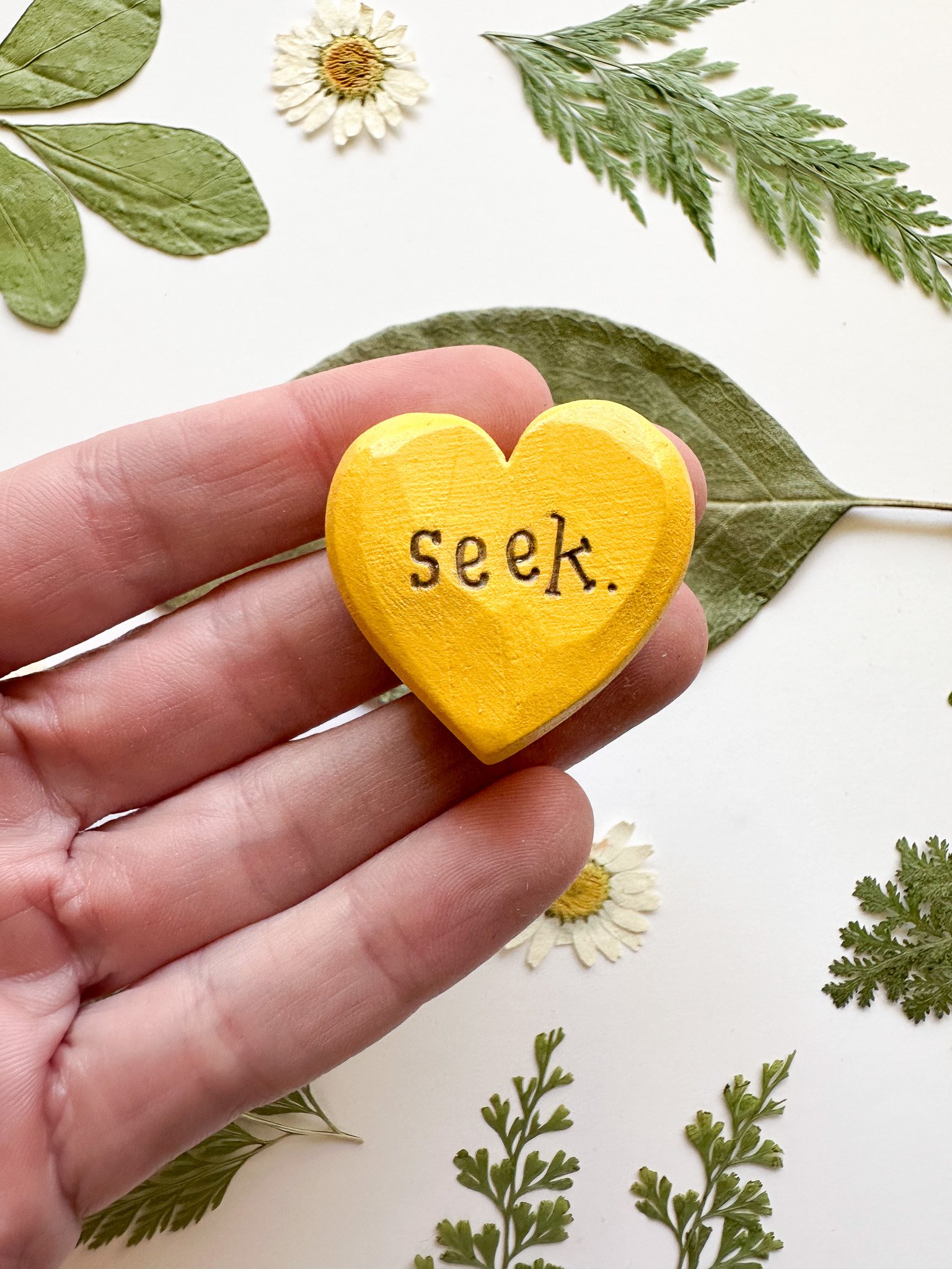 The heart is hand cut, sanded, wood burned, painted, and varnished.