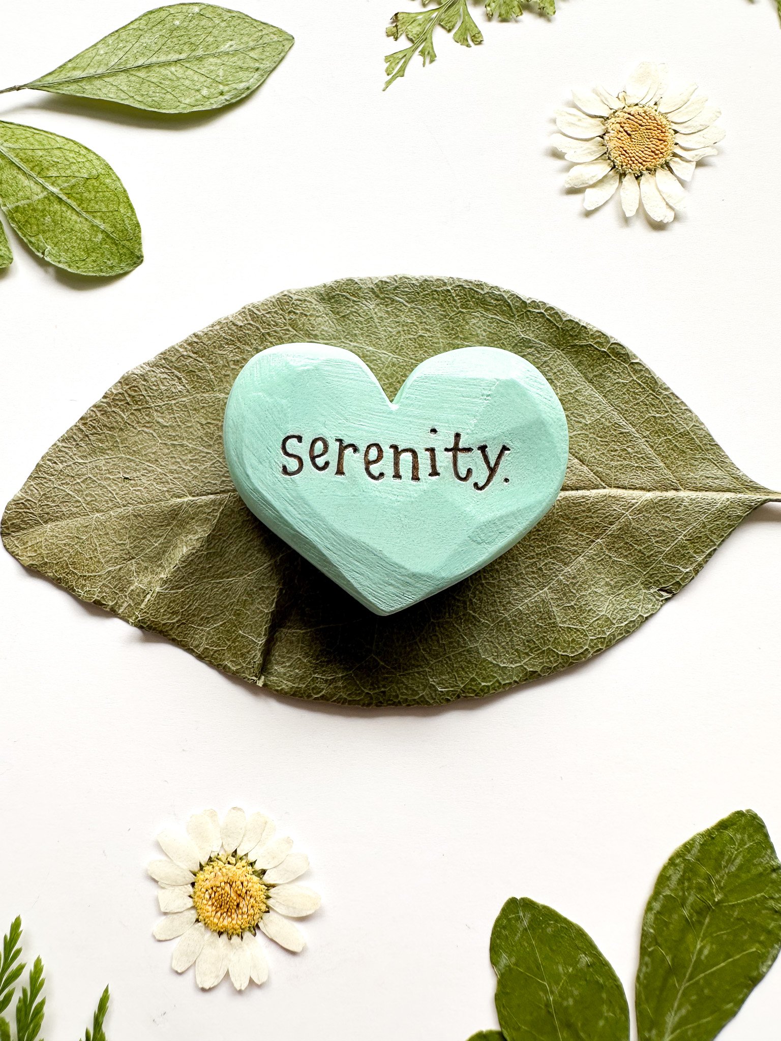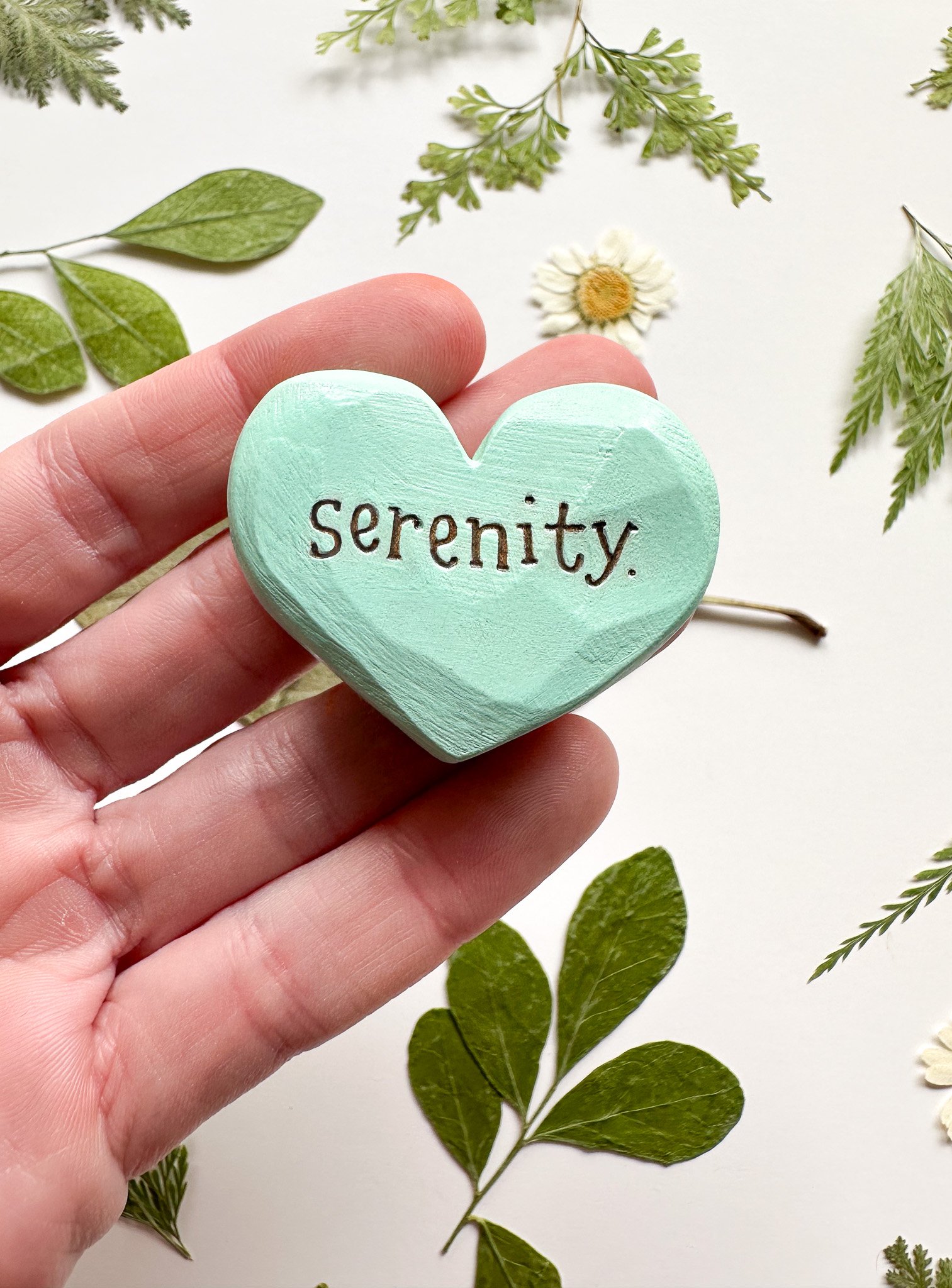 The heart is hand cut, sanded, wood burned, painted, and varnished.