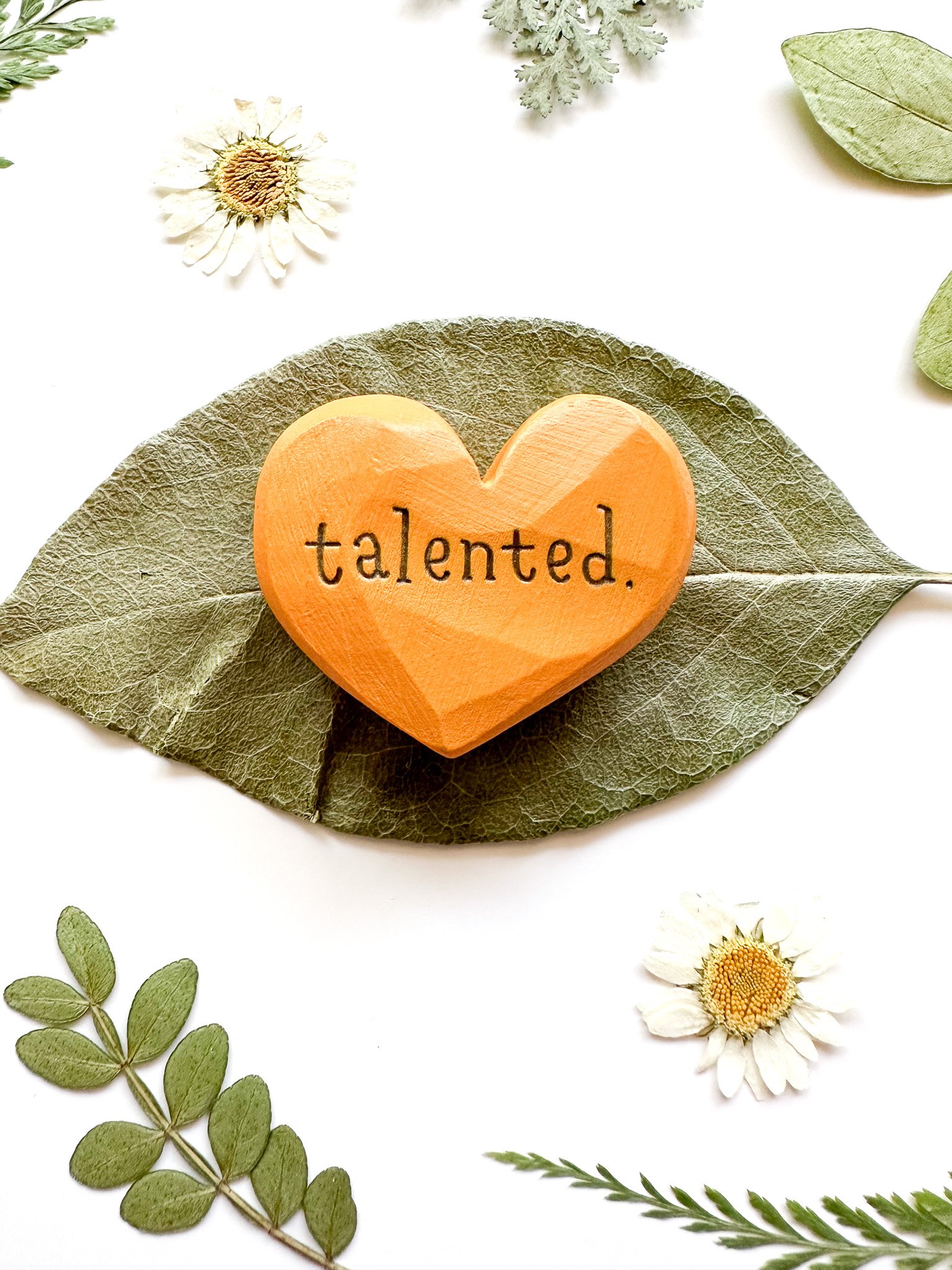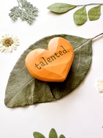 The heart is hand cut, sanded, wood burned, painted, and varnished.