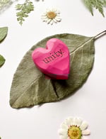 The heart is hand cut, sanded, wood burned, painted, and varnished.
